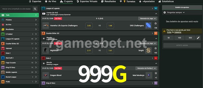 O 999G oferece uma grande seleção de opções de apostas em e-sports com probabilidades competitivas